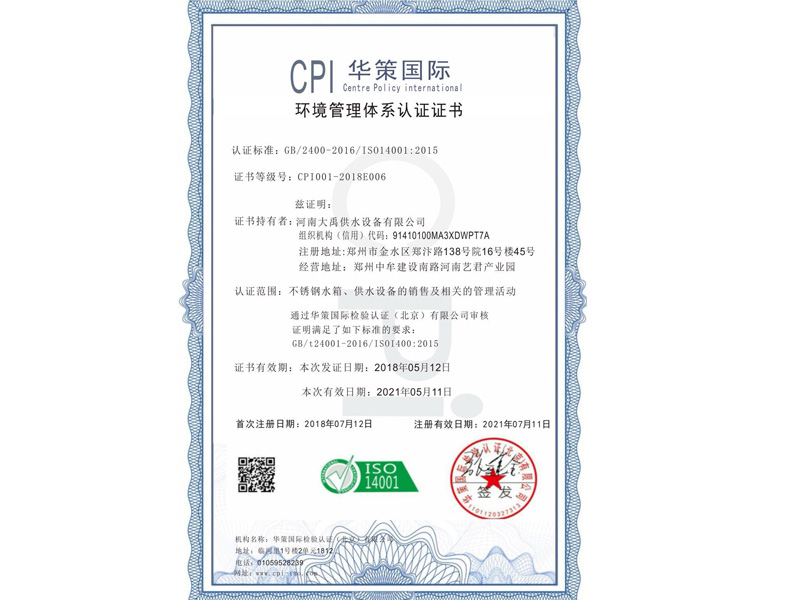環境管理體系認證證書